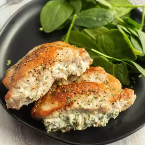 Another delicious dinner option is Baked Stuffed Pork Chops. The pork is moist, and it’s packed with a tasty cheese mixture.