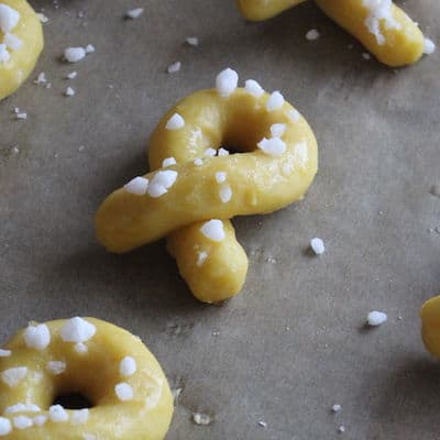 This cookie is one of the most popular Norwegian Christmas Cookie. It also know as berlin wreaths. They are twisted in a pretzel shape and that is how they got their name.